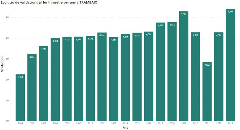 La empresa ha subrayado que con ello "se consolida la tendencia al alza de los últimos meses" y ha recordado que las validaciones del primer trimestre de 2023 aumentaron un 26,59% anual en el Trambaix (un 2,36% respecto al mismo periodo de 2019) y un 29,41% en el caso del Trambesòs (un 0,29% respecto a 2019).