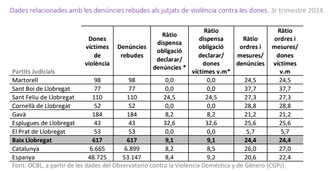 La violencia contra las mujeres sigue siendo una realidad preocupante en el Baix Llobregat. Según el informe publicado por el Observatorio Comarcal del Baix Llobregat (OCBL) a partir de las cifras recogidas por el Observatorio contra la Violencia Doméstica y de Género (CGPJ) muestra un aumento de denuncias por violencia machista en el tercer trimestre de 2024. Con un total de 617 registradas, supone un ligero aumento respecto al mismo periodo del año anterior.