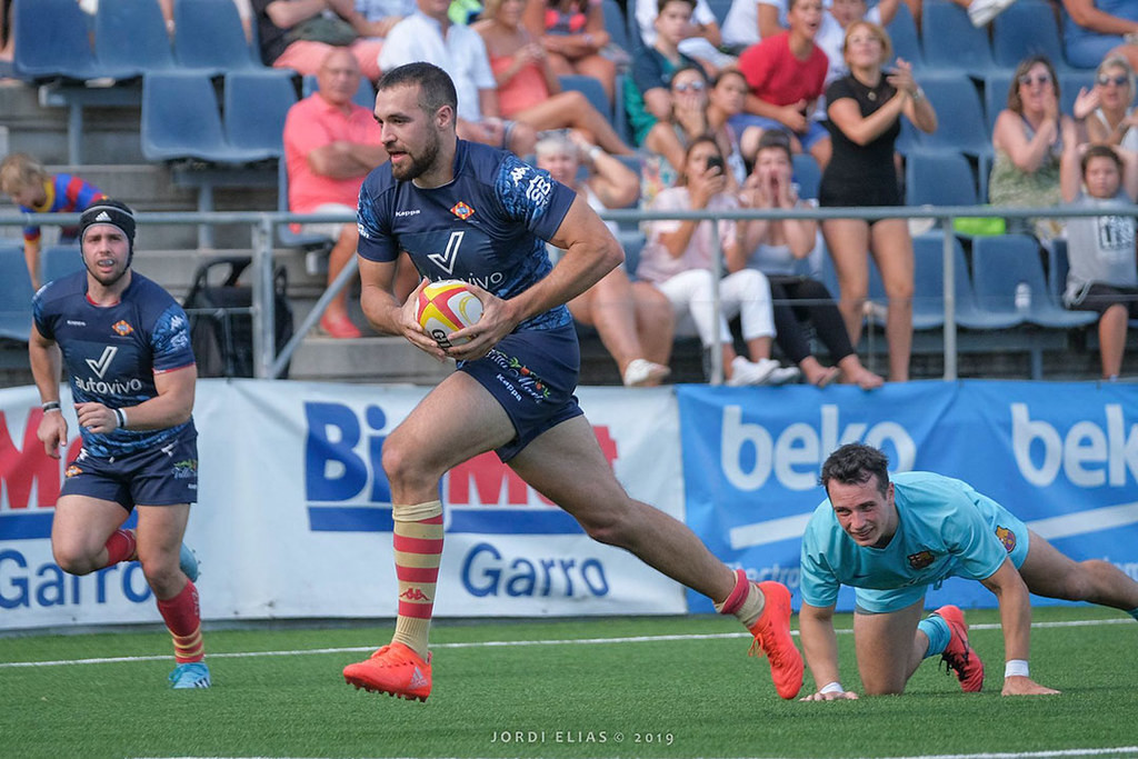 El equipo dirigido por Sergi Guerrero destacó por una gran fortaleza y solvencia defensiva, dejando atrás las dudas en este apartado en el inicio de la temporada, impidiendo el juego ofensivo del conjunto blaugrana. La emoción del derbi estuvo presente en cada uno de los minutos de partido, comenzando con un ritmo altísimo por parte de ambos. Ante la igualdad es cuando aflora el talento y aquí la Santboiana aprovechó el nivel individual de algunos de sus jugadores, concretamente Eschenbach y Unai Fernández, que anotaron dos ensayos para adelantar a los visitantes antes del minuto 15 de la primera parte.