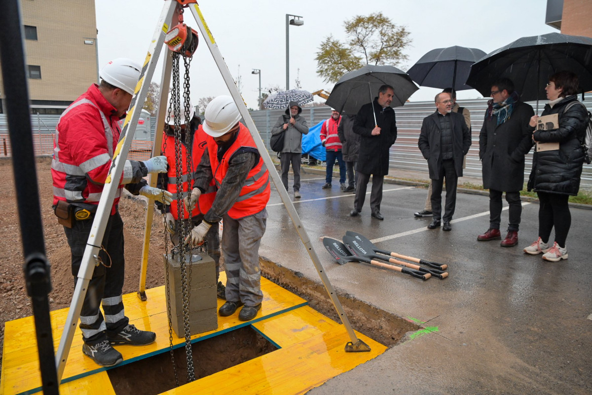 El alcalde de El Prat de Llobregat, Lluís Mijoler Martínez, y el consejero de Derechos Sociales de la Generalitat, Carles Campuzano Danés, acompañados por la arquitecta Judith Leclerc, han colocado la primera piedra de la nueva residencia asistida municipal para personas grandes de El Prat.