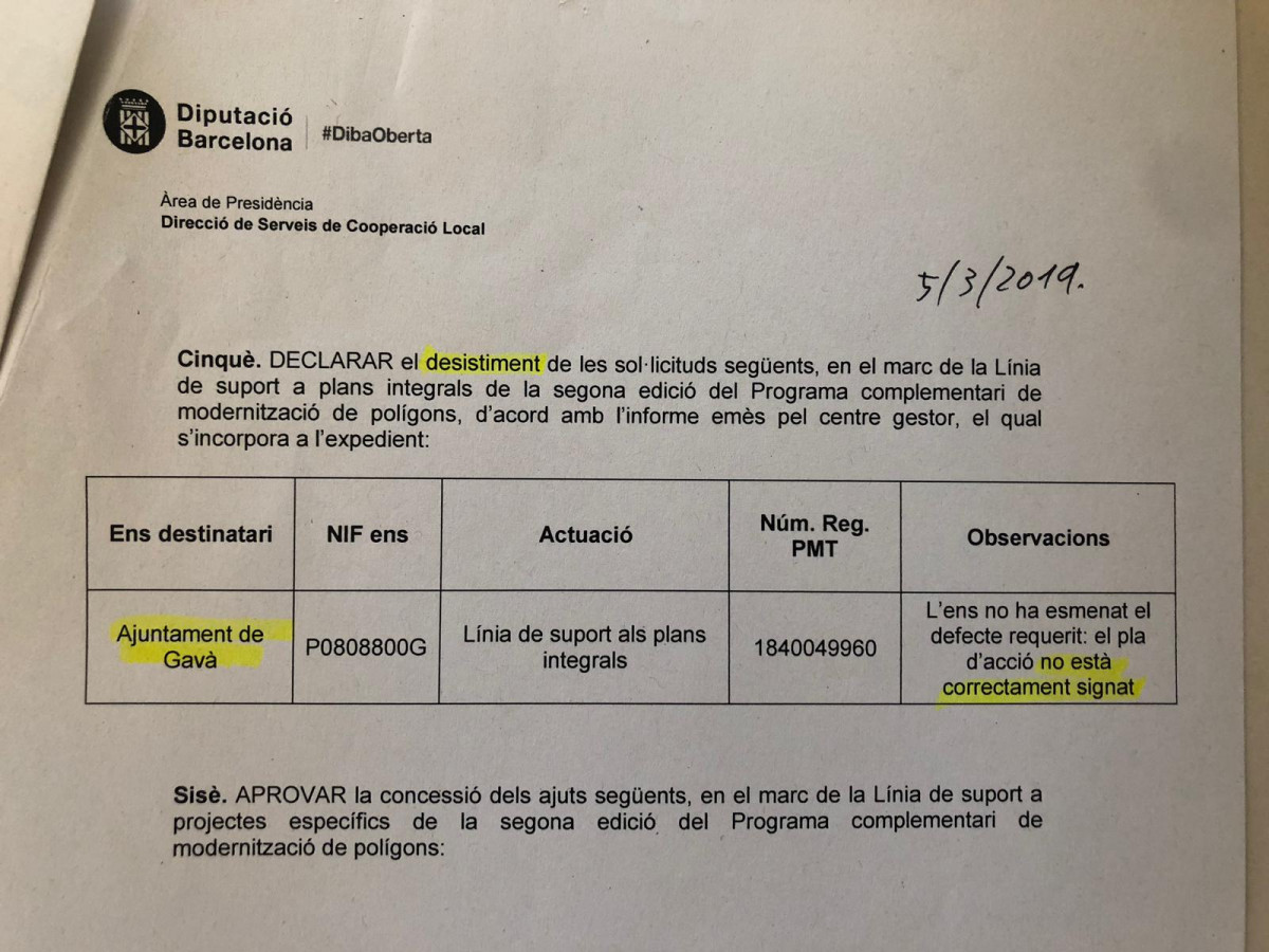 Lo cierto es que, en parte, la versión del ayuntamiento es cierta. En el texto del dictamen sobre el concurso abierto por la Diputació especifíca que han tenido que seleccionar unos pocos ayuntamientos porque se han presentado muchos. Y sí dicen claramente que desastiman el plan integral para los polígonos de Gavà, claro que, en las observaciones especifica claramente que e debe a que "el ente [el ayuntamiento de Gavà] no ha corregido el defecto requerido" en un primer momento: "no está correctamente firmado".