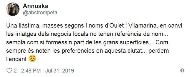 El caso es más sangrante cuando el propio ayuntamiento compartió el vídeo desde su cuenta oficial de Twitter empleando el hashtag #TastaViladecans, que supuestamente está dedicado a promocionar el comercio de proximidad.