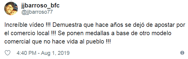Sin embargo, tras su difusión en redes sociales, algunos de los vecinos han respondido con enfado e indignación ante el completo olvido del comercio local durante el minuto que dura el vídeo.