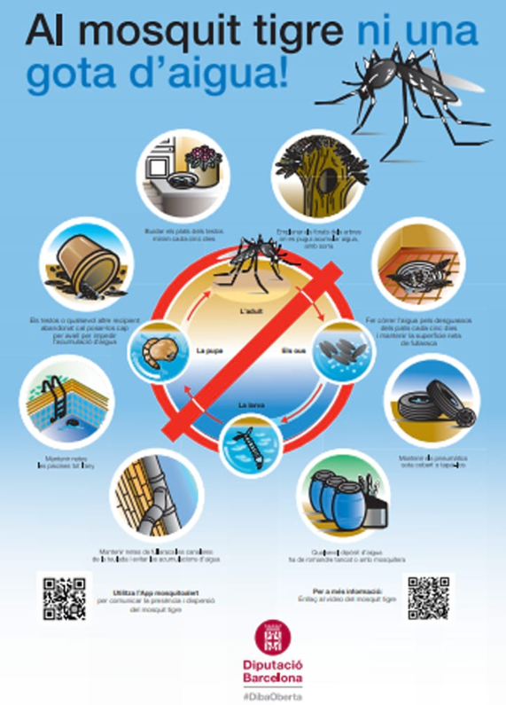 Con el objetivo de sensibilizar la ciudadanía y minimizar los riesgos derivados de la presencia del mosquito tigre, el Servicio de Salud Pública de la Diputación de Barcelona pose a disposición de los ayuntamientos diversos materiales como por ejemplo un video (con una versión larga y una versión corta) y un cartel, con el eslogan "Al mosquito tigre, ni una gota de agua".