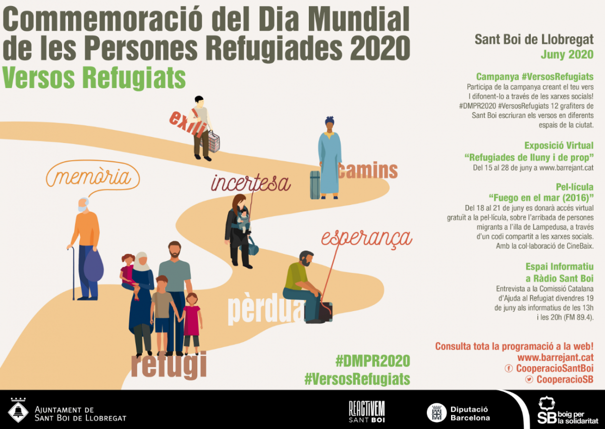 #VersosRefugiats es la propuesta con la cual se conmemorará el #DMPR2020 en Sant Boi. Es una campaña que se adapta a las restricciones de movimiento del contexto actual y combina una propuesta participativa por medio de las redes sociales con una programación de actividades online , todo en torno al valor de las palabras.