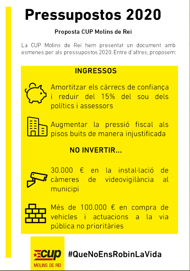 LA CUP INFORMA SOBRE SUS PROPUESTAS A LOS PRESUPUESTOS 2020