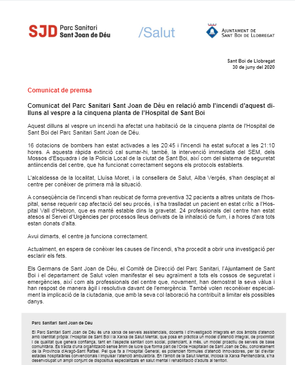 Desde Sant Joan de Déu, el Comitè de Dirección del Parc Sanitari, el Ayuntamiento de Sant Boi y el departamento de Salud agradecen a todos los cuerpos de seguridad y emergencias, así como a los profesionales del centro que han demostrado su valía y han respondido de manera ágil y resolutiva ante la emergencia. También quieren reconocer especialmente la implicación de la ciudadanía, que con su colaboración ha contribuido a limitar los posibles daños.
